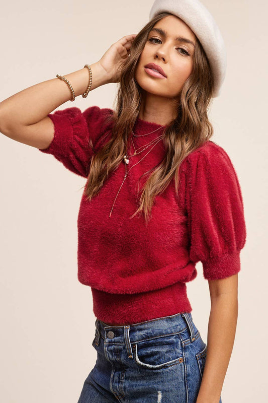Red Plaid Ruffled Mock Neck Top with Puff Sleeve